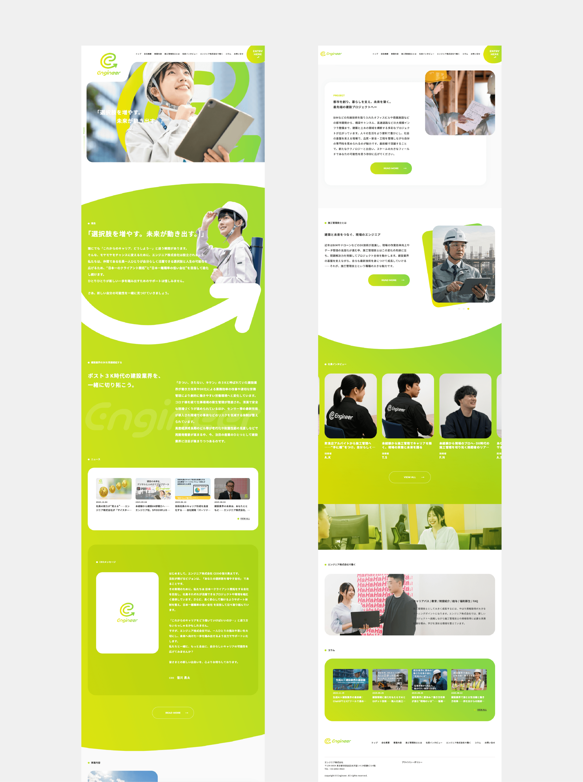 建設業界向けの人材派遣・職業紹介のプロフェッショナル、エンジニア社のCI開発。ロゴやWEBのデザインを担当。迷路を模した「e」は人生の迷いを抜け出し、新たな選択肢とともに未来に向かって動き出す躍動を表現し、イエローからグリーンへのグラデーションは、初心者マークから着想し、これから芽生える可能性やキャリアアップを表現。