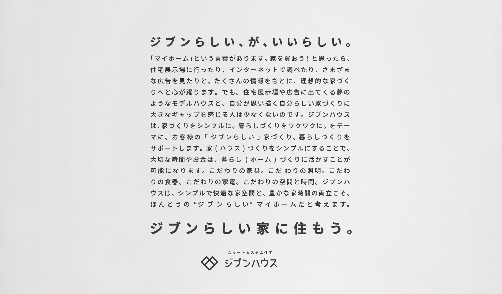 ハウスメーカーJIBUN HAUS.のブランドコンセプトとなるキービジュアルのデザインを担当。物件そのだけではなく、そこでの暮らしにまでも寄り添っていくブランドであるという事を日常に溶け込むちょっとしたこだわりのアイテムとコピーによって表現。